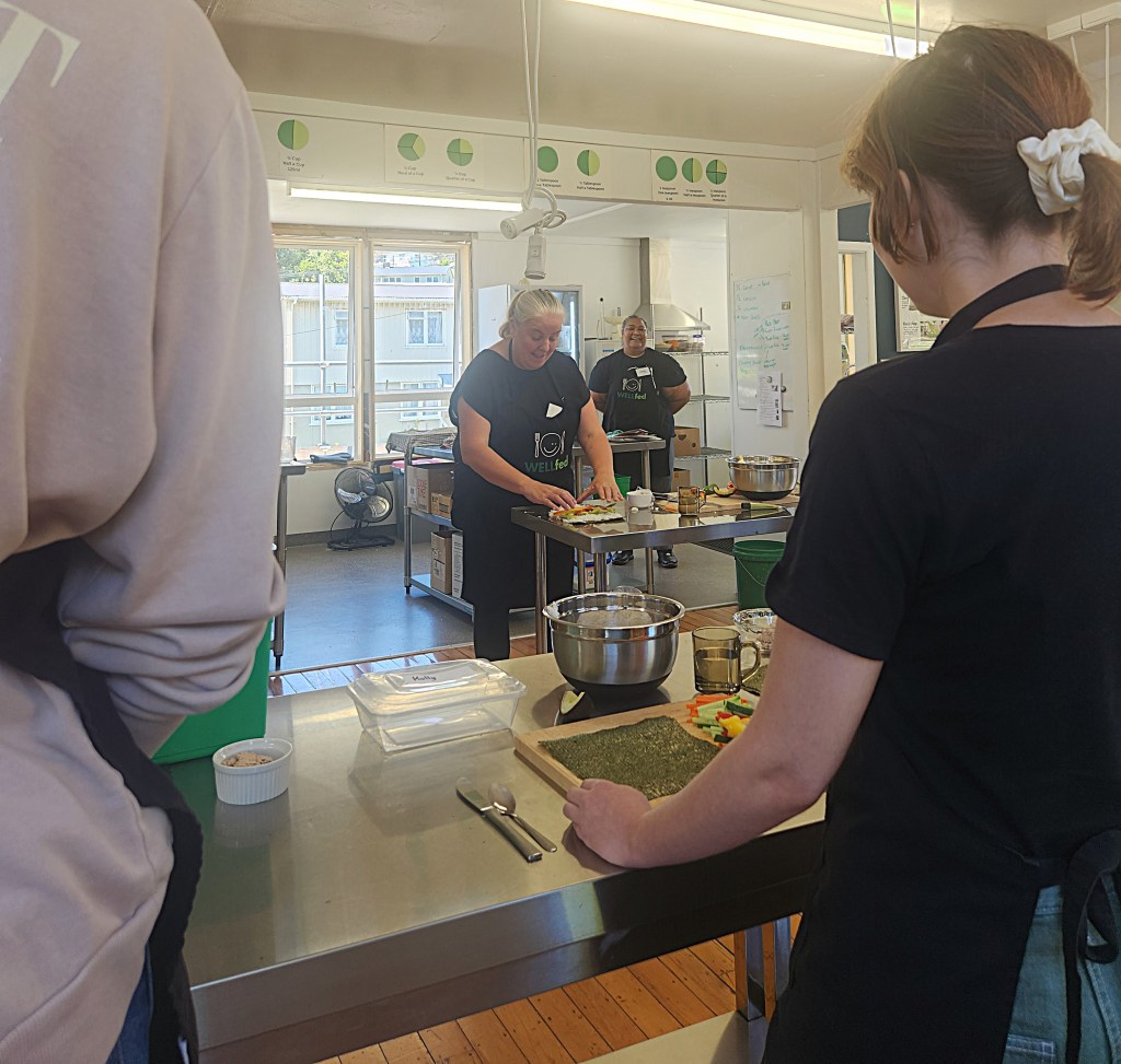 Amanda and Kim from WellFed led a two-part practical workshop, guiding rangatahi through planning, nurturing, and harvesting crops in portable containers. Rangatahi selected from a variety of leafy greens and herbs to cultivate. The hands-on experience continued in the kitchen, where rangatahi engaged in an educational and enjoyable sushi-making activity. This helped build practical skills and confidence in preparing healthy meals.